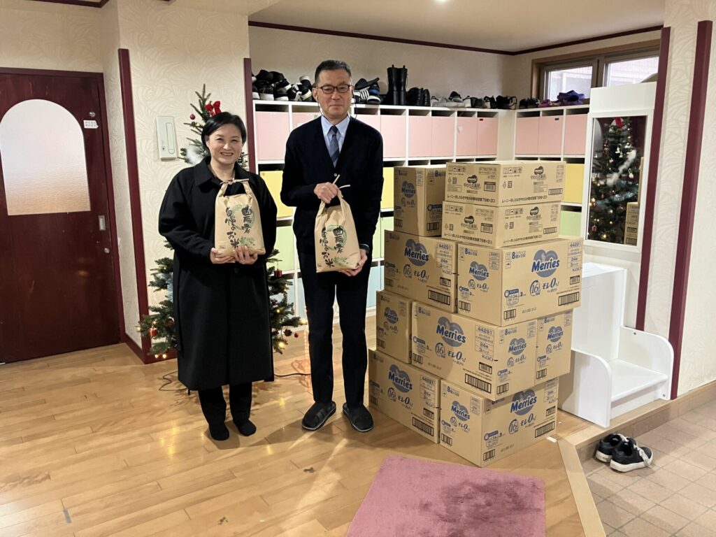 12月23日(火)、じぶん不動産㈱様からおむつ10箱、おしり拭き2箱、お米10㎏をご寄贈いただきました。とても助かります。ありがとうございました。
