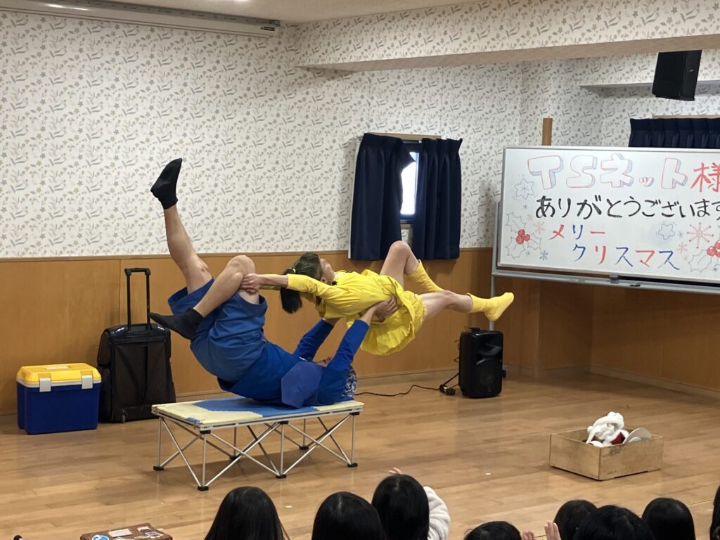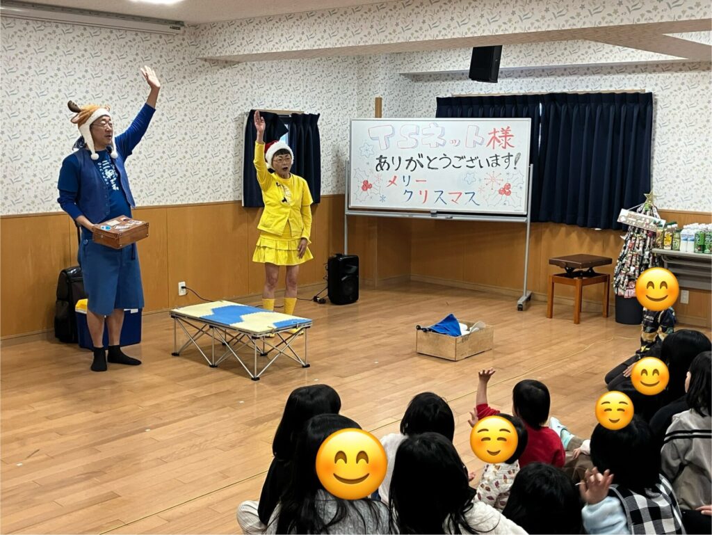 12月23日(火)、㈱TSネット(代表取締役 高橋 明)様の計らいでパフォーマーの三朝(さんちょう)さんと、うたこさんのパフォーマンスショーを見せていただきました。2人の息の合ったショーに大きな歓声と拍手がおきました。終わりにお菓子とジュースをいただいて子ども達は大満足、大喜びでした。いつもありがとうございます。