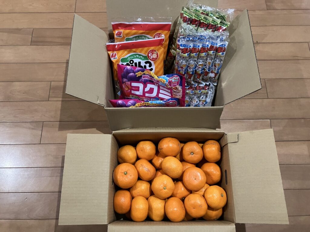 12月22日(月)、真野俊則様からたくさんのお菓子とみかんをいただきました。ありがとうございました。